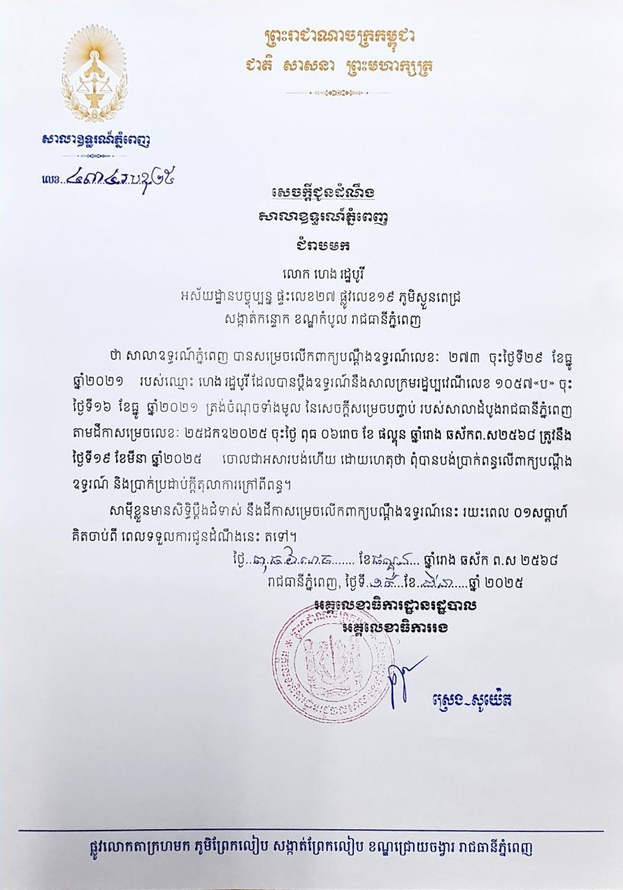 លិខិតជូនដំណឹងអំពីការលើកពាក្យបណ្តឹងឧទ្ធរណ៍