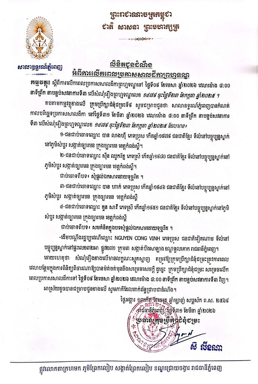 លិខិតជូនដំណឹងស្តីពីការលើកពេលប្រកាសសាលដីកា
