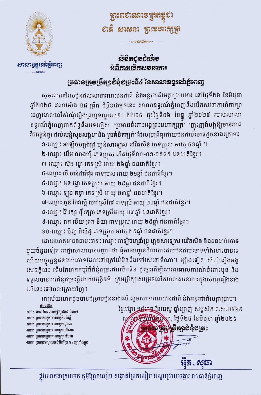 ប្រធានក្រុមប្រឹក្សាជំនុំជម្រះទីIV នៃសាលាឧទ្ធរណ៍ភ្នំពេញ សូមគោរពជំរាបជូនដល់សាធារណៈជនជាតិ និងអន្តរជាតិ មេត្តាជ្រាបថា នៅថ្ងៃទី ២៦ ខែមិថុនា ឆ្នាំ២០២៥ វេលាម៉ោង ០៨ៈ០០នាទីព្រឹក សាលាឧទ្ធរណ៍ភ្នំពេញនឹងបើកសវនាការពិភាក្សាដេញដោលលើសំណុំរឿងព្រហ្មទណ្ឌលេខ ២២១៥ ចុះថ្ងៃទី០៦ ខែធ្នូ ឆ្នាំ២០២៤ ពាក់ព័ន្ធនឹងបទល្មើស "ប្រមាថចំពោះអង្គព្រះមហាក្សត្រ" "ញុះញង់បង្កឱ្យមានភាពវឹកវរធ្ងន់ធ្ងរដល់សន្តិសុខសង្គម" និង "រួមគំនិតក្បត់" កម្មវិធីសវនាការតាមកាលបរិច្ឆេទខាងលើត្រូវលើកទៅថ្ងៃក្រោយវិញ ដោយហេតុថាជនជាប់ចោទឈ្មោះ អាឡិចហ្សង់ដ្រូ ហ្គន់សាឡេស ដេវិតសិន និងជនជាប់ចោទមួយចំនួនទៀត អាជ្ញាសាលាបានបញ្ជាក់ថា ពុំអាចបញ្ជូនដីកាកោះដល់ជនជាប់ចោទទាំងនោះបានទេ ហើយបច្ចុប្បន្នជនជាប់ចោទដែលនៅក្រៅឃុំមិនដឹងទៅរស់នៅទីណា។