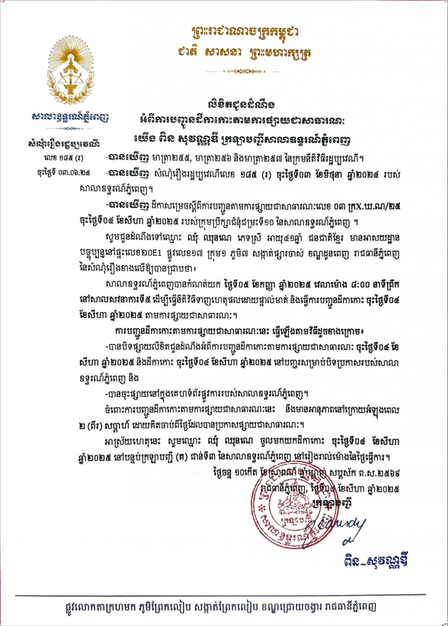 យើង ពិន សុវណ្ណឌី ក្រឡាបញ្ជីសាលាឧទ្ធរណ៍ភ្នំពេញ សូមជូនដំណឹងទៅឈ្មោះ ឈុំ ឈុនណេ ភេទស្រី អាយុ៤១ឆ្នាំ ជនជាតិខ្មែរ មានអាសយដ្ឋានបច្ចុប្បន្នផ្ទះលេខ២០E1 ផ្លូវលេខ១៧ ក្រុម១ ភូមិ៧ សង្កាត់ផ្សារចាស់ ខណ្ឌដូនពេញ រាជធានីភ្នំពេញ ជាភាគីនៃសំណុំរឿងរដ្ឋប្បវេណីលេខ ១៨៥(រ) ចុះថ្ងៃទី ០៣ ខែមិថុនា ឆ្នាំ២០២៤ ឱ្យបានជ្រាបថា សាលាឧទ្ធរណ៍ភ្នំពេញបានកំណត់យកថ្ងៃទី ០៥ ខែកញ្ញា ឆ្នាំ២០២៥ វេលាម៉ោង ០៨ៈ០០នាទីព្រឹក នៅសាលសវនាការទី៥ ដើម្បីធ្វើនីតិវិធីទាញហេតុផលដោយផ្ទាល់មាត់។