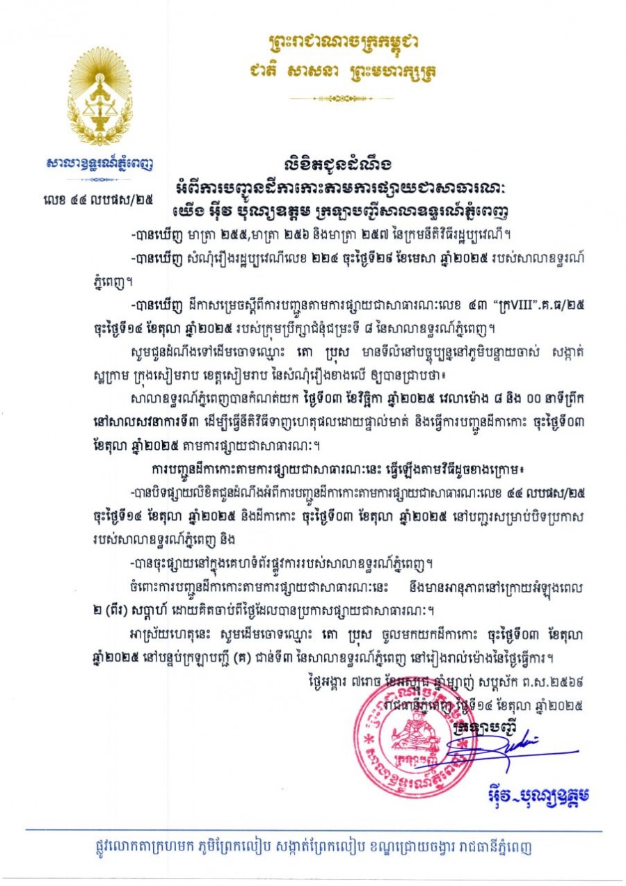 យើង អ៊ីវ បុណ្យឧត្តម ក្រឡាបញ្ជីសាលាឧទ្ធរណ៍ភ្នំពេញ សូមជូនដំណឹងទៅឈ្មោះ តោ ប្រុស មានអាសយដ្ឋានបច្ចុប្បន្នភូមិបន្ទាយចាស់ សង្កាត់ស្លក្រាម ក្រុងសៀមរាប ខេត្តសៀមរាប ជាភាគីដើមចោទនៃសំណុំរឿងរដ្ឋប្បវេណីលេខ ២២៤ ចុះថ្ងៃទី២៩ ខែមេសា ឆ្នាំ២០២៥ ឱ្យបានជ្រាបថា សាលាឧទ្ធរណ៍ភ្នំពេញបានកំណត់យកថ្ងៃទី ០៣ ខែវិច្ឆិកា ឆ្នាំ២០២៥ វេលាម៉ោង ០៨ៈ០០នាទីព្រឹក នៅសាលសវនាការទី៣ ដើម្បីធ្វើនីតិវិធីទាញហេតុផលដោយផ្ទាល់មាត់។