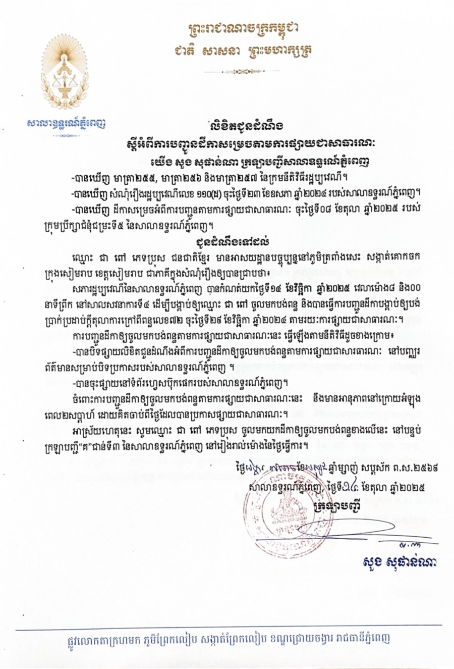 យើង សួង សុផាន់ណា ក្រឡាបញ្ជីសាលាឧទ្ធរណ៍ភ្នំពេញ សូមជូនដំណឹងទៅឈ្មោះ ជា ពៅ ជនជាតិខ្មែរ មានអាសយដ្ឋានបច្ចុប្បន្នភូមិត្រពាំងសេះ សង្កាត់គោកចក ក្រុងសៀមរាប ខេត្តសៀមរាប ជាភាគីនៃសំណុំរឿងរដ្ឋប្បវេណីលេខ ១១០(ដ) ចុះថ្ងៃទី២៣ ខែឧសភា ឆ្នាំ២០២៤ ឱ្យបានជ្រាបថា សាលាឧទ្ធរណ៍ភ្នំពេញបានកំណត់យកថ្ងៃទី ១៤ ខែវិច្ឆិកា ឆ្នាំ២០២៥ វេលាម៉ោង ០៨ៈ០០នាទីព្រឹក នៅសាលសវនាការទី៤ ដើម្បីធ្វើនីតិវិធីទាញហេតុផលដោយផ្ទាល់មាត់។