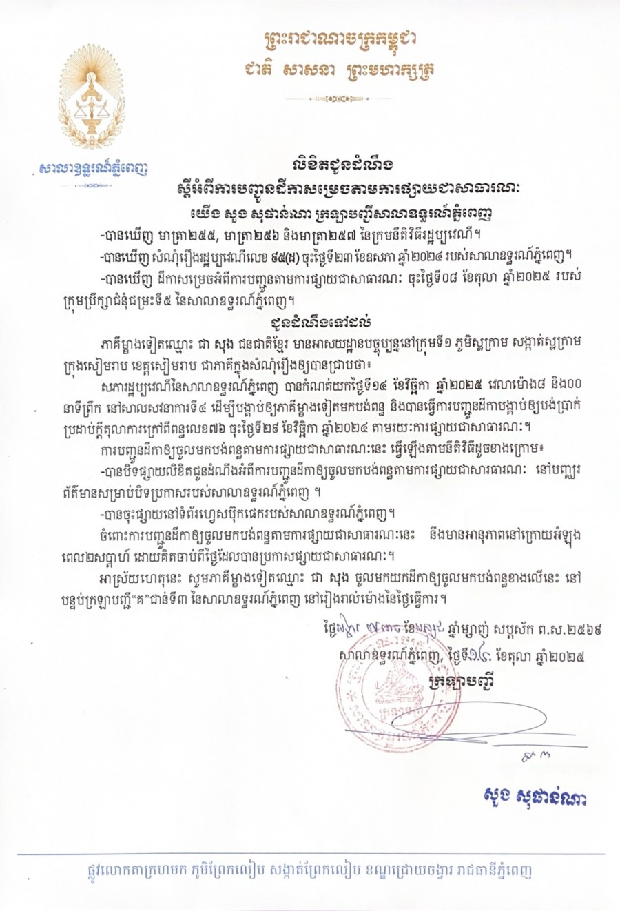 យើង សួង សុផាន់ណា ក្រឡាបញ្ជីសាលាឧទ្ធរណ៍ភ្នំពេញ សូមជូនដំណឹងទៅឈ្មោះ ជា សុង ជនជាតិខ្មែរ មានអាសយដ្ឋានបច្ចុប្បន្នក្រុមទី១ ភូមិស្លក្រាម សង្កាត់ស្លក្រាម ក្រុងសៀមរាប ខេត្តសៀមរាប ជាភាគីនៃសំណុំរឿងរដ្ឋប្បវេណីលេខ ៩៥(ដ) ចុះថ្ងៃទី២៣ ខែឧសភា ឆ្នាំ២០២៤ ឱ្យបានជ្រាបថា សាលាឧទ្ធរណ៍ភ្នំពេញបានកំណត់យកថ្ងៃទី ១៤ ខែវិច្ឆិកា ឆ្នាំ២០២៥ វេលាម៉ោង ០៨ៈ០០នាទីព្រឹក នៅសាលសវនាការទី៤ ដើម្បីបង្គាប់ឱ្យភាគីម្ខាងទៀតមកបង់ពន្ធ និងបានធ្វើការបញ្ជូនដីកាបង្គាប់ឱ្យបង់ប្រាក់ប្រដាប់ក្តីតុលាការក្រៅពីពន្ធលេខ៧៦ ចុះថ្ងៃទី២៩ ខែវិច្ឆិកា ឆ្នាំ២០២៤ តាមការផ្សាយជាសាធារណៈ។