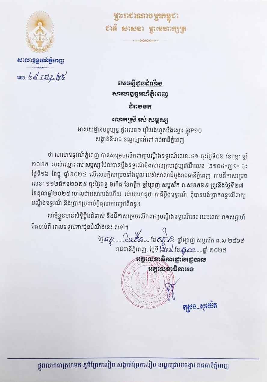 សាលាឧទ្ធរណ៍ភ្នំពេញ ជម្រាបមកលោកស្រី រស់ សម្ភស្ស អាស័យដ្ឋានបច្ចុប្បន្នផ្ទះលេខ១ បុរីប៉េងហួតបឹងស្នោរ ផ្លូវP១០ សង្កាត់និរោធ ខណ្ឌច្បារអំពៅ រាជធានីភ្នំពេញ ថា សាលាឧទ្ធរណ៍ភ្នំពេញបានសម្រេចលើកបណ្តឹងឧទ្ធរណ៍លេខ ៤១ ចុះថ្ងៃទី០៦ ខែកុម្ភៈ ឆ្នាំ២០២៥ ដែលបានប្តឹងឧទ្ធរណ៍នឹងសាលក្រមរដ្ឋប្បវេណីលេខ ២១០៤"ញ១" ចុះថ្ងៃទី១៦ ខែធ្នូ ឆ្នាំ២០២៤ ត្រង់ចំណុចសេចក្តីសម្រេចទាំងមូល របស់សាលាដំបូងរាជធានីភ្នំពេញ តាមដីកាសម្រេចលេខ ១១២ដកឧ២០២៥ ចុះថ្ងៃចន្ទ ៦កើត ខែកត្តិក ឆ្នាំម្សាញ់ សប្តស័ក ព.ស២៥៦៩ ត្រូវនឹងថ្ងៃទី២៧ ខែតុលា ឆ្នាំ២០២៥ ចោលជាអសារបង់ហើយ ដោយហេតុថា ពុំបានបង់ប្រាក់ពន្ធលើពាក្យបណ្តឹងឧទ្ធរណ៍ និងប្រាក់ប្រដាប់ក្តីតុលាការក្រៅពីពន្ធ។