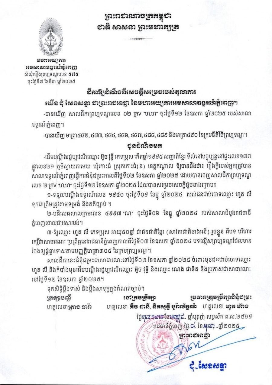 ដីកាឱ្យដំណឹងពីសេចក្តីសម្រេចរបស់តុលាការ