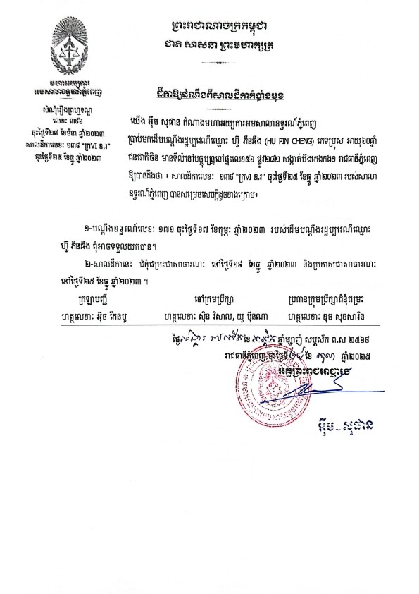 លិខិតជូនដំណឹងស្តីអំពីការបញ្ជូនដីកាកោះតាមការផ្សាយជាសាធារណៈ