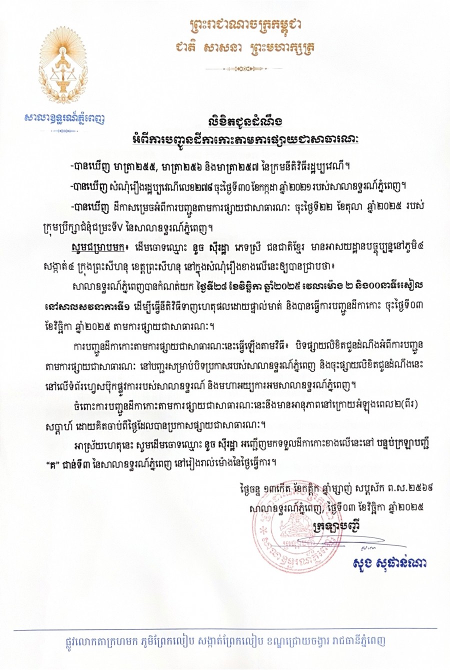 យើង សួង សុផាន់ណា ក្រឡាបញ្ជីសាលាឧទ្ធរណ៍ភ្នំពេញ សូមជូនដំណឹងទៅដើមចោទឈ្មោះ នូច ស៊ីរដ្ឋា ភេទស្រី ជនជាតិខ្មែរ មានអាសយដ្ឋានបច្ចុប្បន្នស្ថិតនៅភូមិ៤ សង្កាត់៤ ក្រុងព្រះសីហនុ ខេត្តព្រះសីហនុ ជាភាគីដើមចោទនៃសំណុំរឿងរដ្ឋប្បវេណីលេខ ២៧៩ ចុះថ្ងៃទី៣០ ខែកក្កដា ឆ្នាំ២០២១ ឱ្យបានជ្រាបថា សាលាឧទ្ធរណ៍ភ្នំពេញបានកំណត់យកថ្ងៃទី ២៨ ខែវិច្ឆិកា ឆ្នាំ២០២៥ វេលាម៉ោង ០២ៈ០០នាទីរសៀល នៅសាលសវនាការទី១ ដើម្បីធ្វើនីតិវិធីទាញហេតុផលដោយផ្ទាល់មាត់។