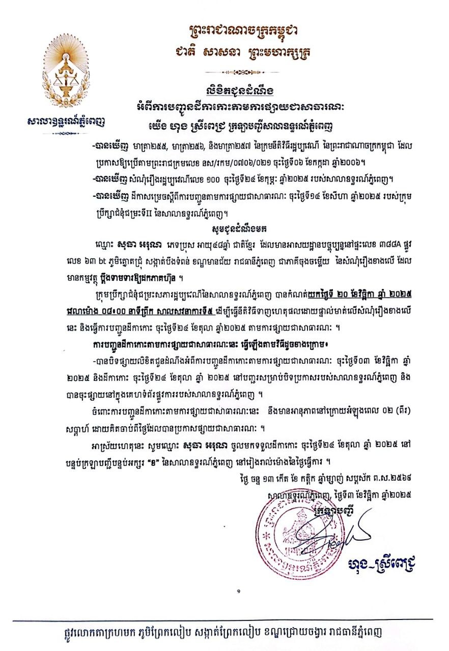 យើង ហុង ស្រីពេជ្រ ក្រឡាបញ្ជីសាលាឧទ្ធរណ៍ភ្នំពេញ សូមជូនដំណឹងទៅឈ្មោះ សុធា អរុណ ភេទប្រុស អាយុ៤៨ឆ្នាំ ជាតិខ្មែរ មានអាសយដ្ឋានបច្ចុប្បន្នស្ថិតនៅផ្ទះលេខ៣៣៨A ផ្លូវលេខ៦៣bt ភូមិត្នោតជ្រុំ សង្កាត់បឹងទំពន់ ខណ្ឌមានជ័យ រាជធានីភ្នំពេញុ ជាភាគីចុងចម្លើយនៃសំណុំរឿងរដ្ឋប្បវេណីលេខ ១០០ ចុះថ្ងៃទី២៤ ខែកុម្ភៈ ឆ្នាំ២០២៥ ឱ្យបានជ្រាបថា សាលាឧទ្ធរណ៍ភ្នំពេញបានកំណត់យកថ្ងៃទី ២០ ខែវិច្ឆិកា ឆ្នាំ២០២៥ វេលាម៉ោង ០៨ៈ០០នាទីព្រឹក នៅសាលសវនាការទី៥ ដើម្បីធ្វើនីតិវិធីទាញហេតុផលដោយផ្ទាល់មាត់។