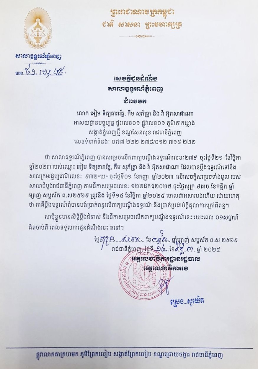 សាលាឧទ្ធរណ៍ភ្នំពេញ ជម្រាបមកលោក អៀម ទិត្យតារារ័ត្ន, កឹម សុភ័ក្ត្រា និង វ៉ា អ៊ុតសាផាណា អាស័យដ្ឋានបច្ចុប្បន្នផ្ទះលេខ០១ ភូមិគោកឃ្លាង សង្កាត់ភ្នំពេញថ្មី ខណ្ឌសែនសុខ រាជធានីភ្នំពេញ ថា សាលាឧទ្ធរណ៍ភ្នំពេញបានសម្រេចលើកបណ្តឹងឧទ្ធរណ៍លេខ ២៧៩ ចុះថ្ងៃទី២១ ខែវិច្ឆិកា ឆ្នាំ២០២៣ ដែលបានប្តឹងឧទ្ធរណ៍នឹងសាលក្រមរដ្ឋប្បវេណីលេខ ៩៣២"ឃ" ចុះថ្ងៃទី០១ ខែកញ្ញា ឆ្នាំ២០២៣ ត្រង់ចំណុចសេចក្តីសម្រេចទាំងមូល របស់សាលាដំបូងរាជធានីភ្នំពេញ តាមដីកាសម្រេចលេខ ១២២ដកឧ២០២៥ ចុះថ្ងៃសុក្រ ៩រោច ខែកត្តិក ឆ្នាំម្សាញ់ សប្តស័ក ព.ស២៥៦៩ ត្រូវនឹងថ្ងៃទី១៤ ខែវិច្ឆិកា ឆ្នាំ២០២៥ ចោលជាអសារបង់ហើយ ដោយហេតុថា ពុំបានបង់ប្រាក់ពន្ធលើពាក្យបណ្តឹងឧទ្ធរណ៍ និងប្រាក់ប្រដាប់ក្តីតុលាការក្រៅពីពន្ធ។