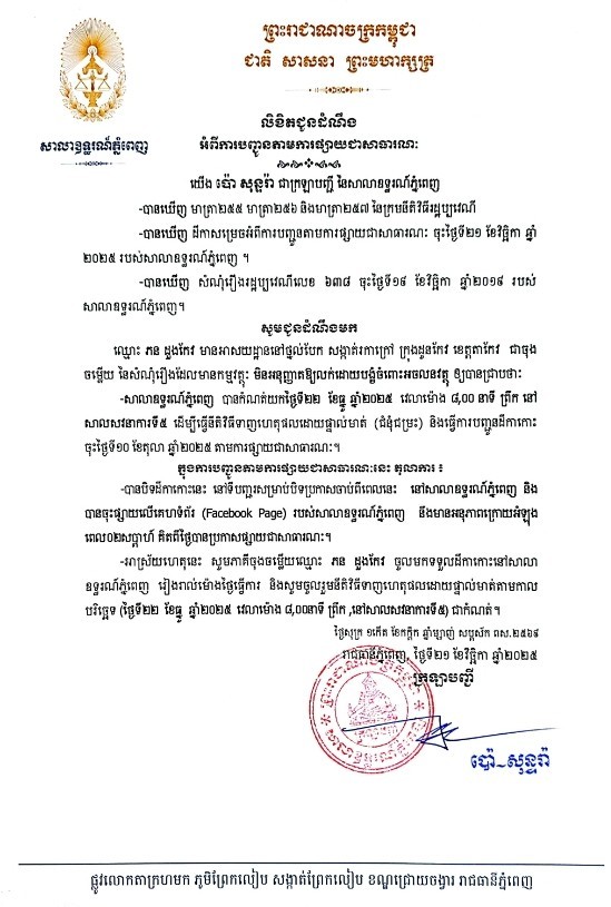 យើង ប៉ោ សុន្ទរ៉ា ក្រឡាបញ្ជីសាលាឧទ្ធរណ៍ភ្នំពេញ សូមជូនដំណឹងទៅឈ្មោះ ភន ដួងកែវ មានអាសយដ្ឋានបច្ចុប្បន្នស្ថិតនៅថ្នល់បែក សង្កាត់រកាក្រៅ ក្រុងដូនកែវ ខេត្តតាកែវ ជាភាគីចុងចម្លើយនៃសំណុំរឿងរដ្ឋប្បវេណីលេខ ៦៣៨ ចុះថ្ងៃទី១៩ ខែវិច្ឆិកា ឆ្នាំ២០១៩ ឱ្យបានជ្រាបថា សាលាឧទ្ធរណ៍ភ្នំពេញបានកំណត់យកថ្ងៃទី ២២ ខែធ្នូ ឆ្នាំ២០២៥ វេលាម៉ោង ០៨ៈ០០នាទីព្រឹក នៅសាលសវនាការទី៥ ដើម្បីធ្វើនីតិវិធីទាញហេតុផលដោយផ្ទាល់មាត់។