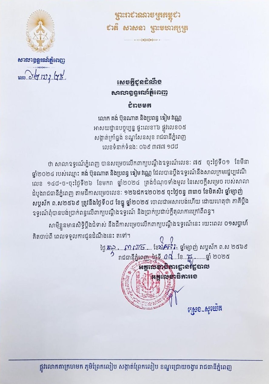 សាលាឧទ្ធរណ៍ភ្នំពេញ ជម្រាបមកលោក គង់ ប៊ុនណាត និងប្រពន្ធ ឌៀម វណ្ណេ អាស័យដ្ឋានបច្ចុប្បន្នផ្ទះលេខT6 ផ្លូវលេខ០៥ សង្កាត់ក្រាំងធ្នង់ ខណ្ឌសែនសុខ រាជធានីភ្នំពេញ ថា សាលាឧទ្ធរណ៍ភ្នំពេញបានសម្រេចលើកបណ្តឹងឧទ្ធរណ៍លេខ ៧៥ ចុះថ្ងៃទី០១ ខែមីនា ឆ្នាំ២០២៤ ដែលបានប្តឹងជំទាស់នឹងសាលក្រមរដ្ឋប្បវេណីលេខ ១៤៨(ច) ចុះថ្ងៃទី២៦ ខែមករា ឆ្នាំ២០២៤ ត្រង់ចំណុចទាំងមូលនៃសេចក្តីសម្រេច របស់សាលាដំបូងរាជធានីភ្នំពេញ តាមដីកាសម្រេចលេខ ១២៦ដកឧ២០២៥ ចុះថ្ងៃចន្ទ ៣រោច ខែមិគសិរ ឆ្នាំម្សាញ់ សប្តស័ក ព.ស២៥៦៩ ត្រូវនឹងថ្ងៃទី០៨ ខែធ្នូ ឆ្នាំ២០២៥ ចោលជាអសារបង់ហើយ ដោយហេតុថា ពុំបានបង់ប្រាក់ពន្ធលើពាក្យបណ្តឹងឧទ្ធរណ៍ និងប្រាក់ប្រដាប់ក្តីតុលាការក្រៅពីពន្ធ។