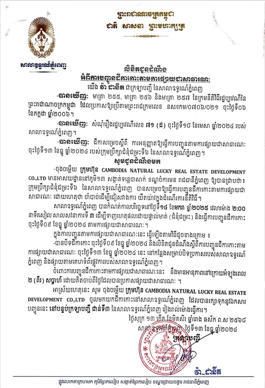យើង វ៉ា ដានីត ក្រឡាបញ្ជីសាលាឧទ្ធរណ៍ភ្នំពេញ សូមជូនដំណឹងមក ក្រុមហ៊ុន Cambodia Natureal Lucky Real Development Co.Ltd មានអាសយដ្ឋានបច្ចុប្បន្ន ភូមិ១៣ សង្កាត់ទន្លេបាសាក់ ខណ្ឌចំការមន រាជធានីភ្នំពេញ ជាភាគីចុងចម្លើយនៃសំណុំរឿងរដ្ឋប្បវេណីលេខ ៧១(ដ) ចុះថ្ងៃទី ១៨ ខែមេសា ឆ្នាំ២០២៤ ឱ្យបានជ្រាបថា សាលាឧទ្ធរណ៍ភ្នំពេញបានកំណត់យកថ្ងៃទី ១៤ ខែមករា ឆ្នាំ២០២៥ វេលាម៉ោង ០២ៈ០០នាទីរសៀល នៅសាលសវនាការទី៣ ដើម្បីធ្វើនីតិវិធីទាញហេតុផលដោយផ្ទាល់មាត់។
