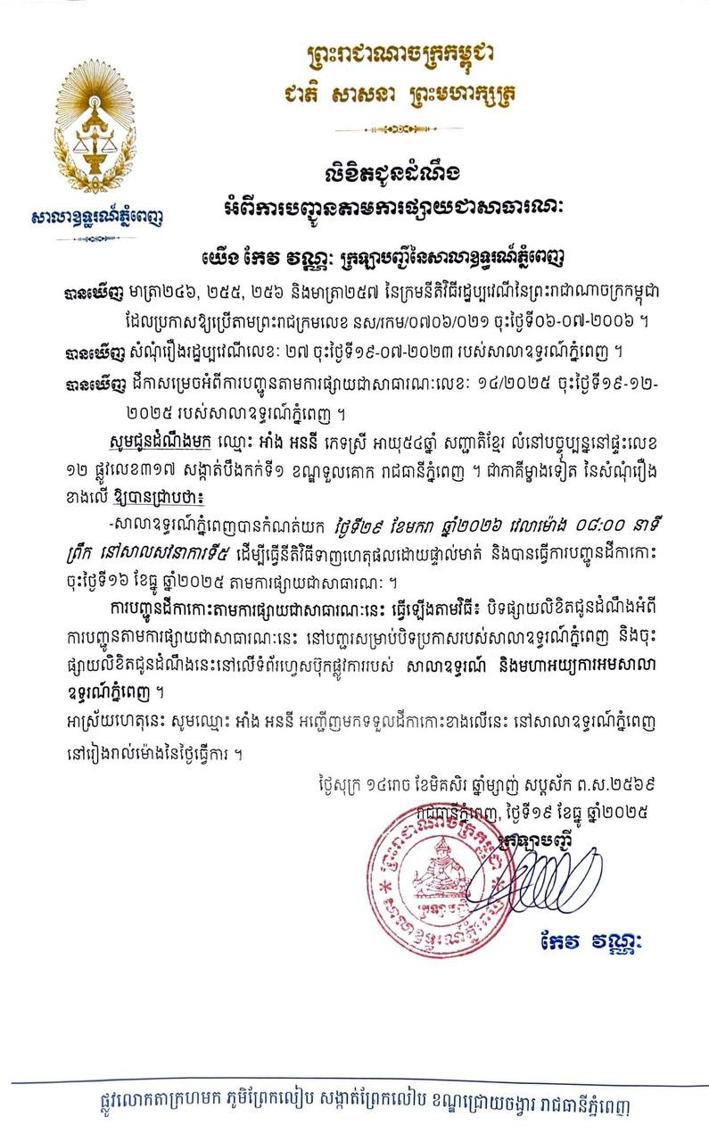 យើង កែវ វណ្ណៈ ក្រឡាបញ្ជីសាលាឧទ្ធរណ៍ភ្នំពេញ សូមជូនដំណឹងមកឈ្មោះ អាំង អននី ភេទស្រី អាយុ៥៤ឆ្នាំ សញ្ជាតិខ្មែរ មានអាសយដ្ឋានបច្ចុប្បន្នស្ថិតនៅផ្ទះលេខ១២ ផ្លូវលេខ៣១៧ សង្កាត់បឹងកក់ទី១ ខណ្ឌទួលគោក រាជធានីភ្នំពេញ ជាភាគីម្ខាងទៀតនៃសំណុំរឿងរដ្ឋប្បវេណីលេខ ២៧ ចុះថ្ងៃទី១៩ ខែកក្កដា ឆ្នាំ២០២៣ ឱ្យបានជ្រាបថា សាលាឧទ្ធរណ៍ភ្នំពេញបានកំណត់យកថ្ងៃទី ២៩ ខែមករា ឆ្នាំ២០២៦ វេលាម៉ោង ០៨ៈ០០នាទីព្រឹក នៅសាលសវនាការទី៥ ដើម្បីធ្វើនីតិវិធីទាញហេតុផលដោយផ្ទាល់មាត់។